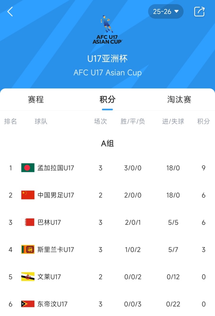 在U17亚初赛积分榜上,孟加拉国3战全胜,净胜球18个,先赛名次小组第一。中国国少现在2轮全胜净胜球同为18,今晚将迎战文莱,取胜就将重回积分榜榜首。