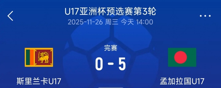 11月26日讯 今全国午为止的一场U17亚洲杯预选赛,孟加拉国5-0大捷斯里兰卡,暂升小组第一。