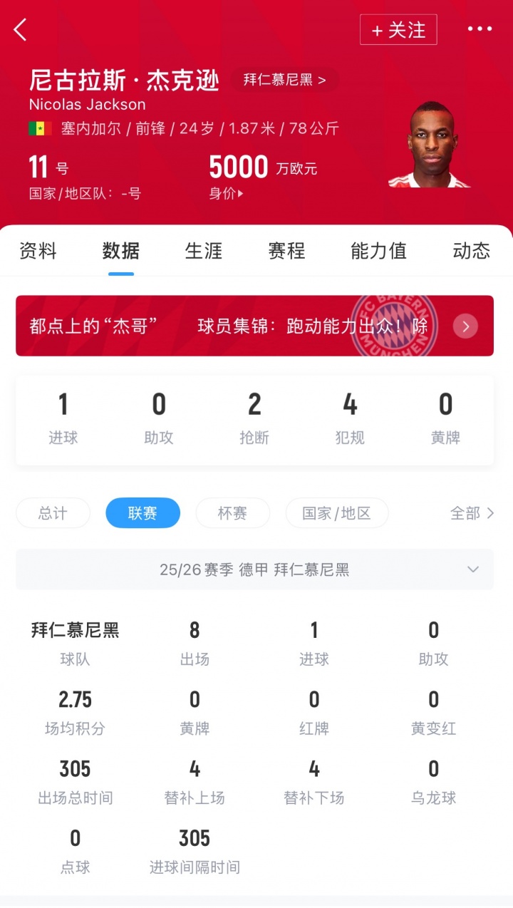 报谈称,杰克逊本赛季后何去何从仍无定论,鉴于他迄今抑止出场技艺有限(各项赛事仅五次首发),当今来看,以埃贝尔为首的拜仁措置层,不太可能在赛季末主动支付租赁公约中商定的无数买断费(6500万欧元)。