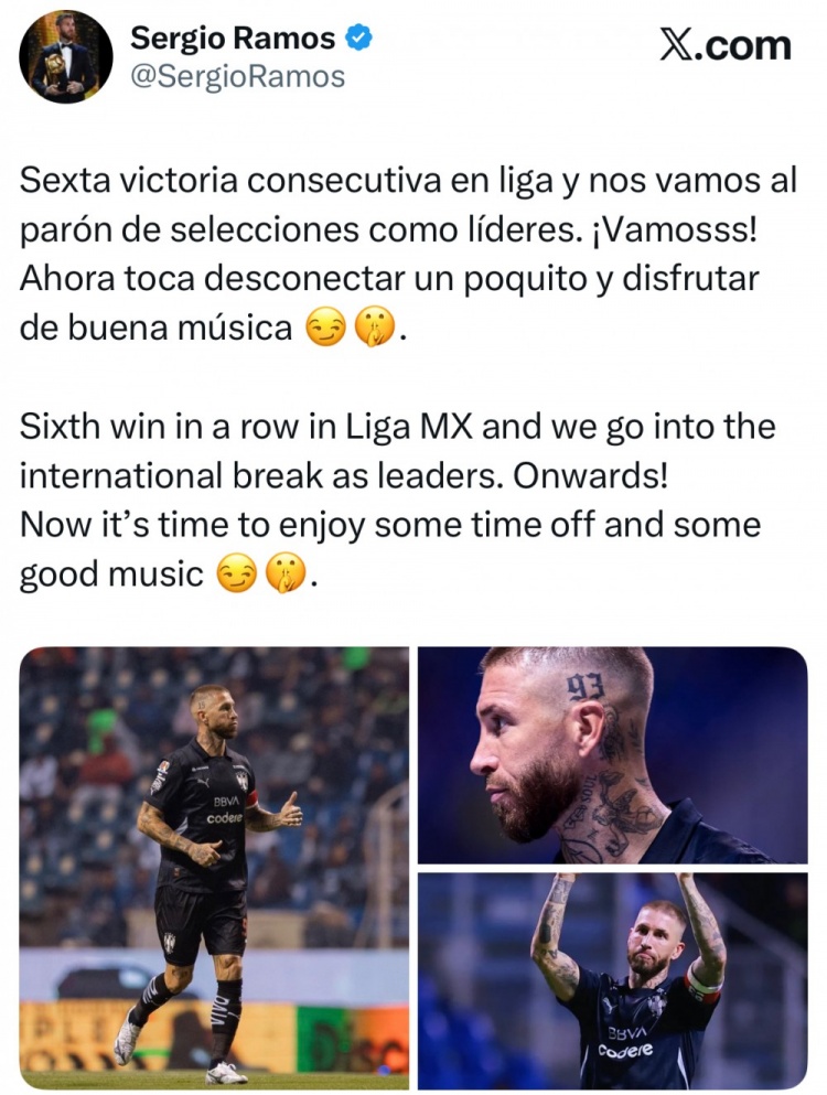 当天拉莫斯更新社媒,晒出我方的比赛照,并用西英双语配文写谈: