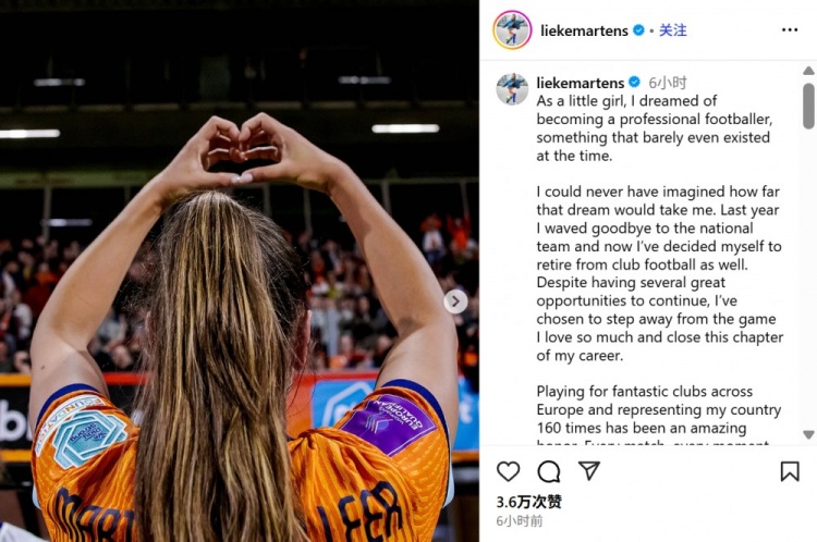 9月2日讯 荷兰女足的32岁前卫列克-马滕斯通过社媒发文,文告退役。她曾遵循过巴萨和巴黎在内的多家欧洲俱乐部,并随荷兰女足得到2017年欧洲杯冠军和2019寰宇杯亚军,她也当选为昔日的寰宇足球密斯。