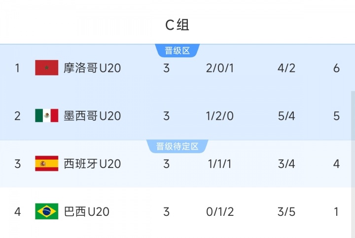 C组第1摩洛哥U20将在后续赛程中,对阵B组第3韩国U20。值得一提的是,C组出局的球队是传统权门巴西U20,世青赛5冠王。