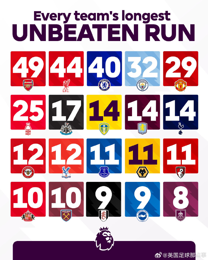 英超各队的最长伙同不败场次一览