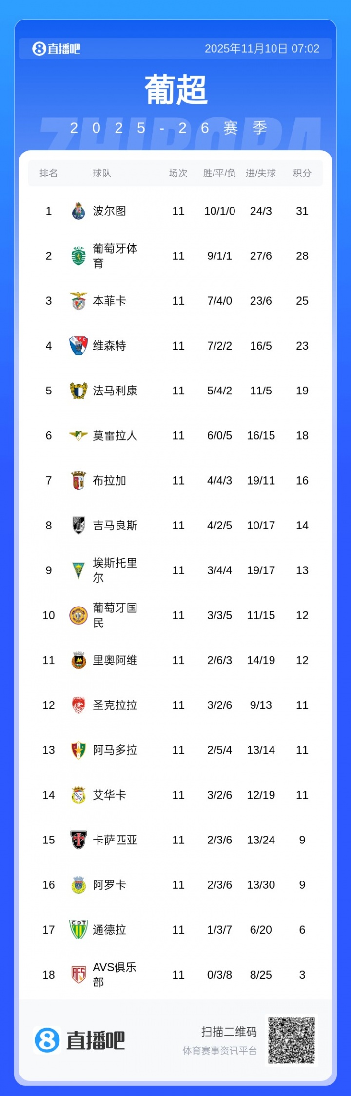 11轮联赛事后,本菲卡暂积25分名次积分榜第3,落伍榜首的波尔图6分。