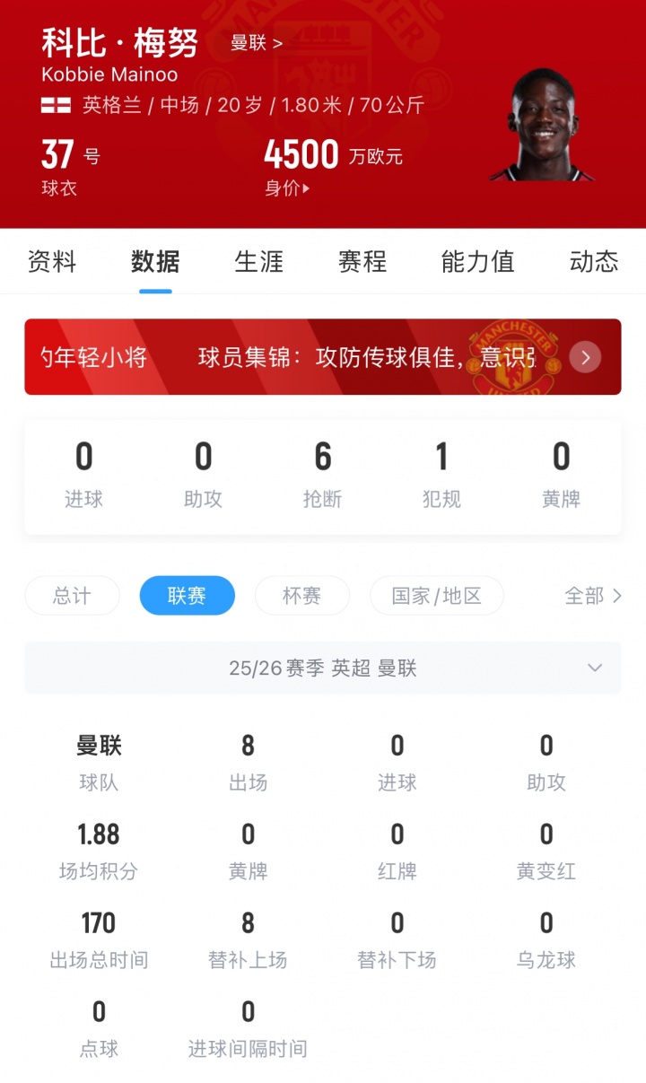 这是梅努本赛季英超的第8次出场,8次出场一齐为替补登场,且共计时长仅为170分钟。