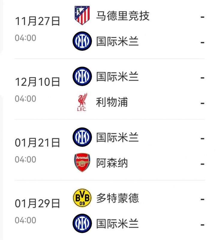 尔后,国米仍要靠近三个壮健的敌手:主场先后迎战利物浦和阿森纳,末轮客战多特。