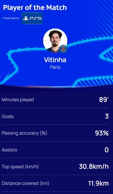 本场比赛维蒂尼亚献技帽子戏法,赛后他也当选欧冠官方评比出的本场比赛最好球员。