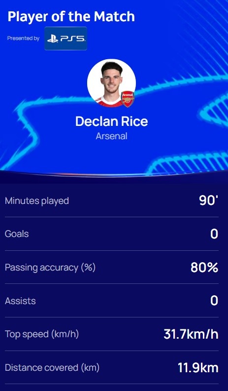 本场比赛赖斯发扬出色,传球顺利率80%,跑动粉饰11.9km,赛后他当选欧冠官方评比出的本场最好球员。