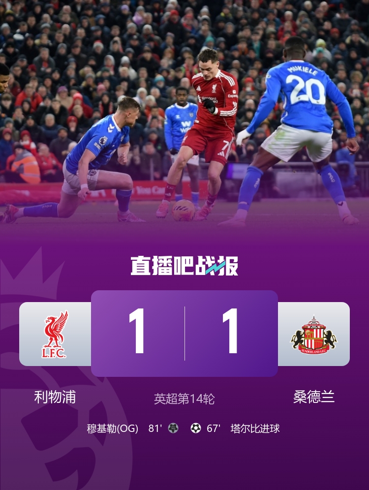英超联赛第14轮,利物浦1-1桑德兰,维尔茨造乌龙,范戴克虚伪。