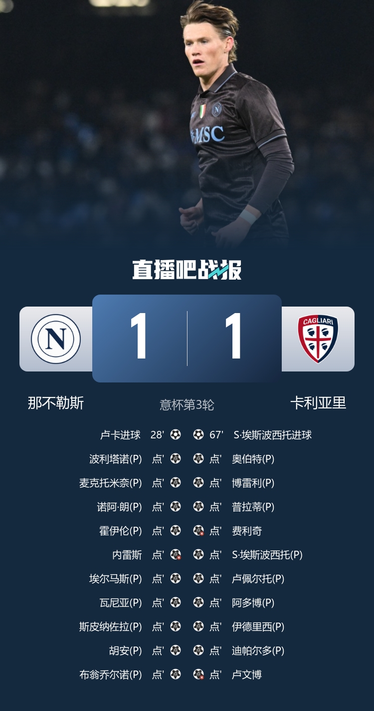 意杯第3轮,那不勒斯点球大战礼服卡利亚里,晋级8强。
