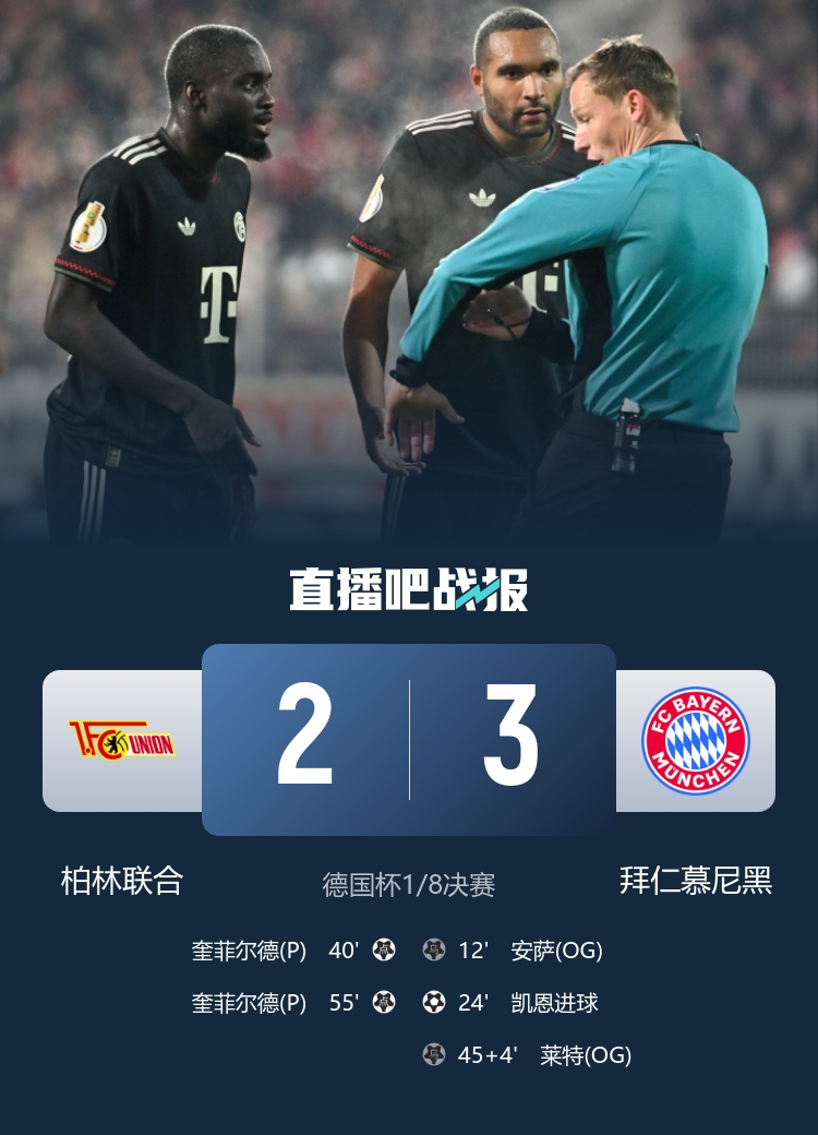 进德国杯八强!拜仁3-2柏林相接 凯恩破门+送点柏林相接两送乌龙