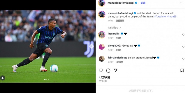 阿坎吉写说念:“一场浪漫的比赛,不是我所期许的开局,但我为能成为这支球队的一员感到骄傲!”