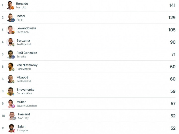 此役事后,哈兰德在欧冠赛场50场比赛打进52球,迥殊51球的亨利,挤进欧冠历史弓手榜前十,与萨拉赫比肩第10位。