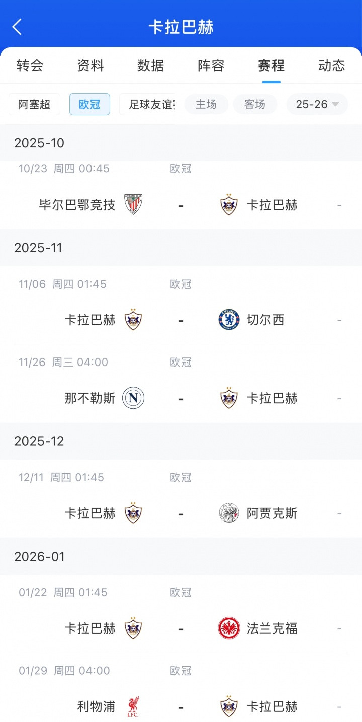 卡拉巴赫接下来欧冠还将濒临切尔西、那不勒斯、利物浦等多队↓
