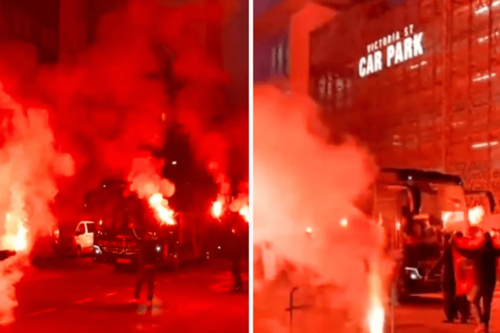 这些画面迅速在社交媒体上传播开来,在加拉塔萨雷赛前下榻的酒店附近的维多利亚街停车场外,街道被灯光弹照得通红。