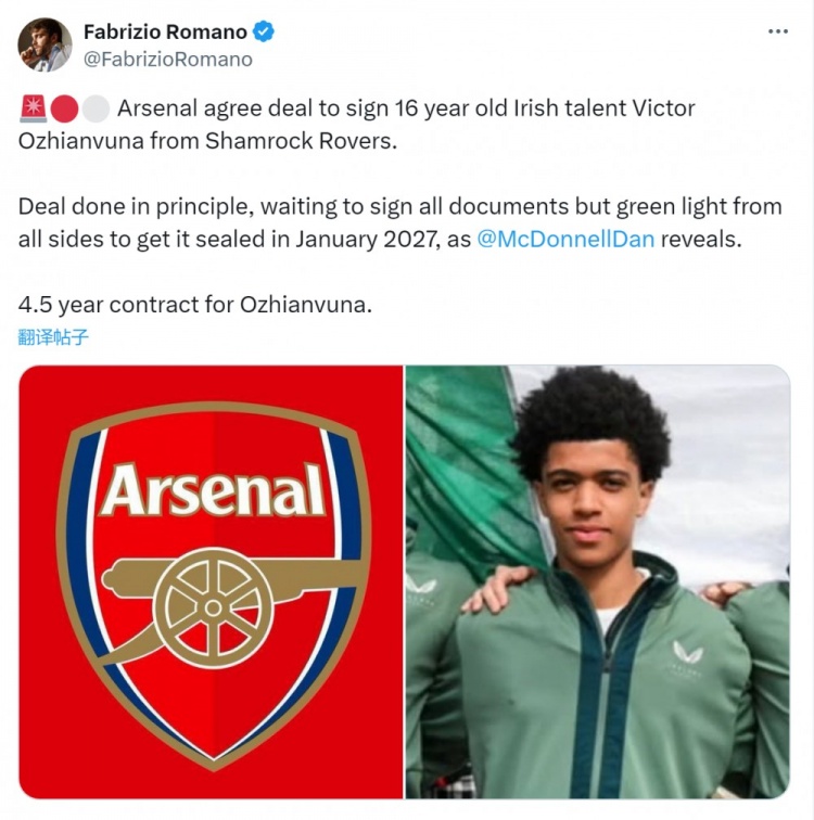 罗马诺显现,阿森纳特意引进爱尔兰小将奥日安武纳,这笔往复仍是竣事原则性契约,恭候签署所有这个词文献,球员将在2027年1月庄重加盟阿森纳,并签下四年半的合同。