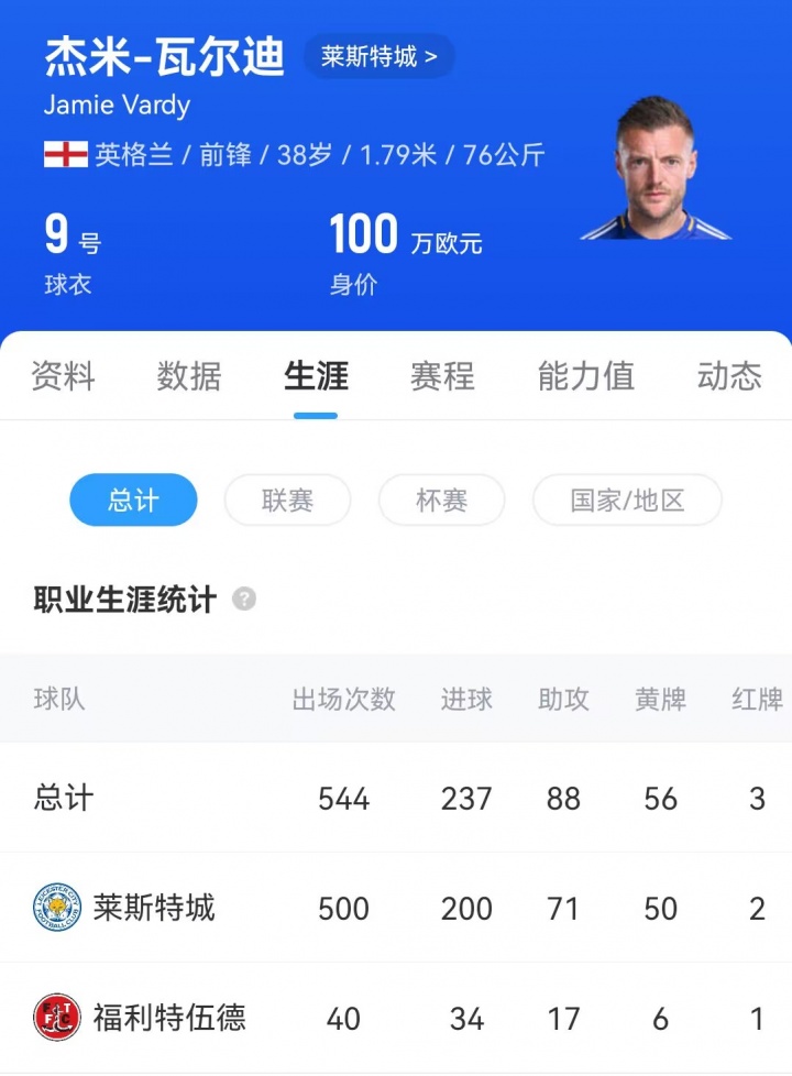 现年38岁的瓦尔迪将作事糊口绝大部分技术齐献给了莱斯特城,共为莱斯卓绝场500次,孝敬200球71助攻;并匡助球队获取15-16赛季的英超冠军等荣誉。本年夏天,瓦尔迪与莱斯特城的合同到期,成为摆脱球员。