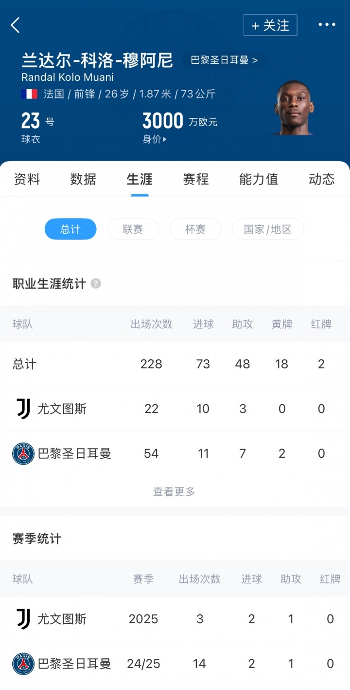 穆阿尼现年26岁,法国时尚。穆阿尼2023年夏窗9500万欧元从法兰克福加盟巴黎,上赛季被巴黎租赁至尤文图斯。效率尤文技艺球员出场22次,孝顺10球3助。现在穆阿尼德回身价为3000万欧元。