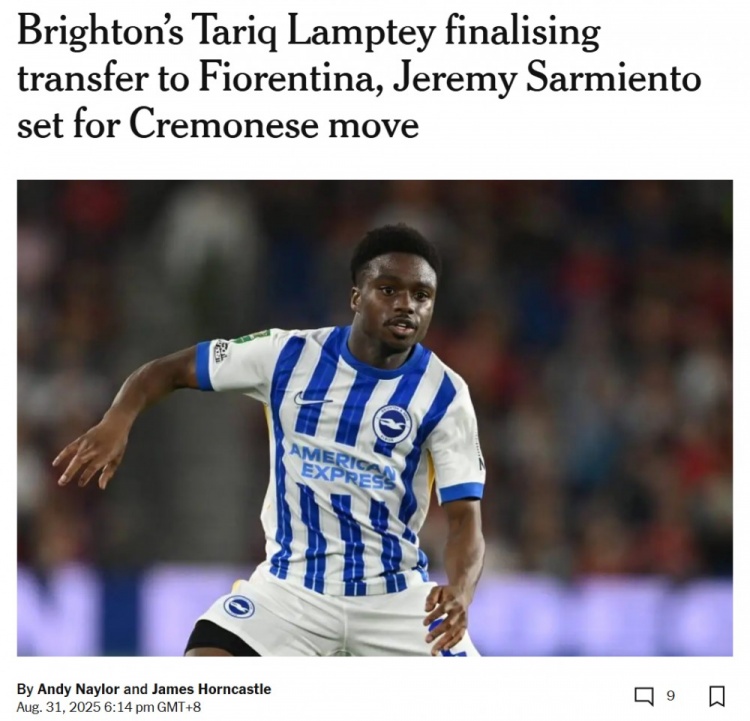 8月31日讯 TA报谈,布莱顿两名球员兰普泰以及萨米恩托将转会意甲,差异去往佛罗伦萨以及克雷莫内塞。