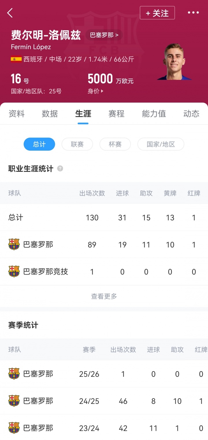22岁的费尔明出自巴萨青训,铁心现在共为巴萨一线队出场89次,打入19球11助攻,他的德回身价为5000万欧元。