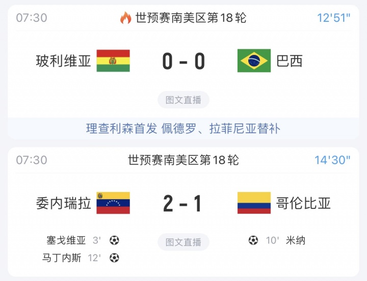 09月10日讯 南好意思世初赛收官战,委内瑞拉开场12分钟2-1卓越,玻利维亚当今0-0巴西,按此比分委内瑞拉将赢得寰宇杯附加赛限额。