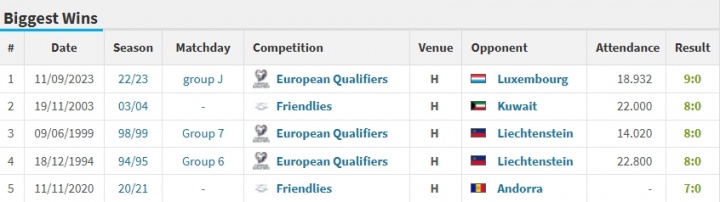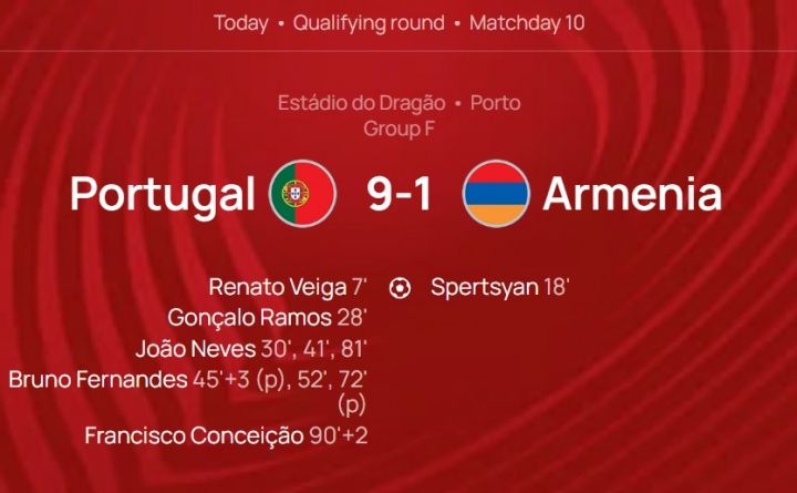 今天9-1的比分追平了葡萄牙2003年8-0科威特,以及1999年和1994年两次8-0列支敦士登,位居葡萄牙队史最大比分告捷榜的第二位。