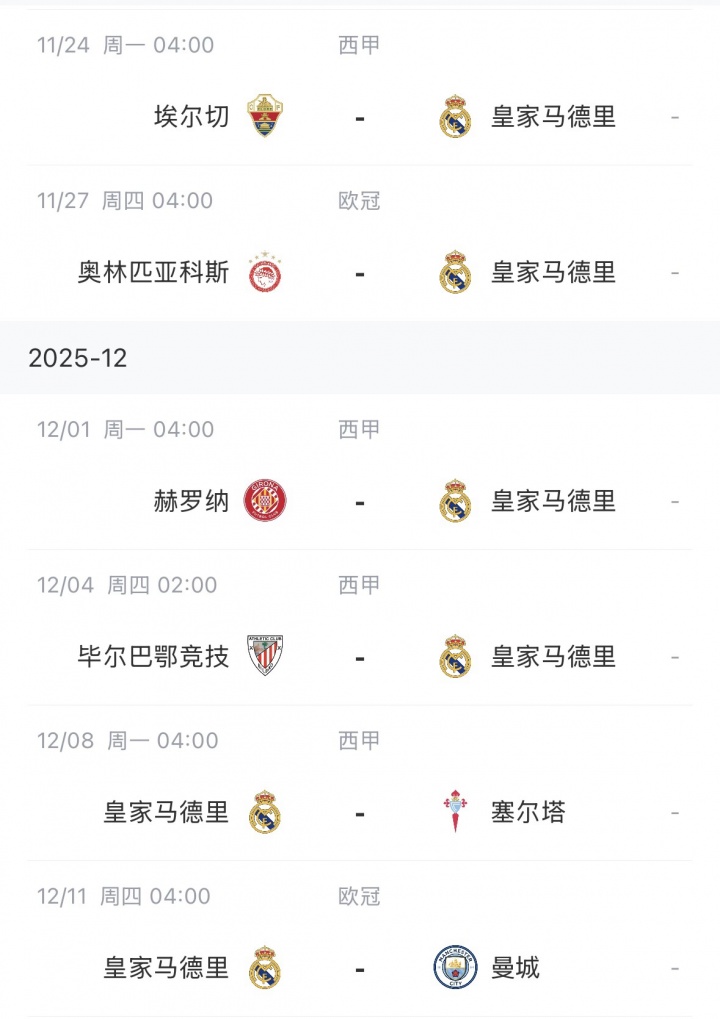 皇马将在海外比赛日浪漫后迎来纠合四个客场,以及将迎来与曼城的欧冠比赛,记者Picon觉得,这是对阿隆索的一次大考,他写说念:“纠合三个客场征程,包括对阵本赛季黑马埃尔切与毕尔巴鄂竞技。而辽远巨兽隐现:与曼城的对决,将成为磨真金不怕火这支球队是否具备抗衡欧洲顶级豪强实力的又一次大考——本赛季他们已两度失利。”