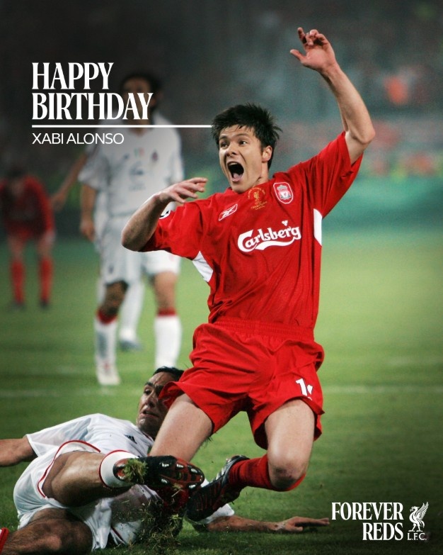 利物浦官方晒海报为哈维·阿隆索庆生,海报实质为2004-05赛季欧冠决赛利物浦打败米兰夺冠的比赛图。