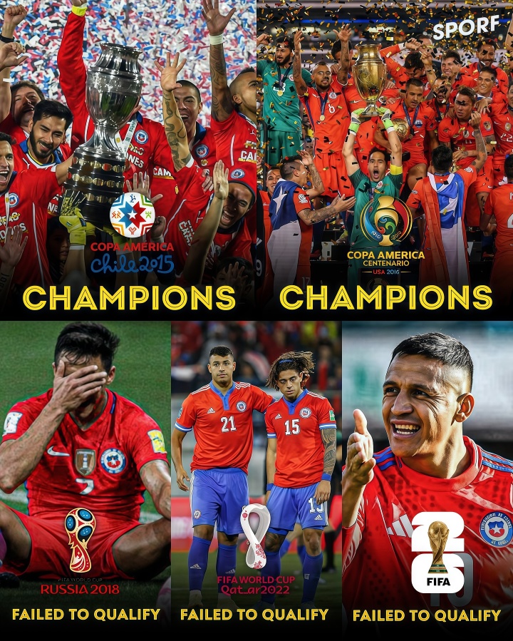 已经在2015、16年连夺两届好意思洲杯的智利,测度3届无缘寰球杯决赛圈,令东说念主唏嘘。